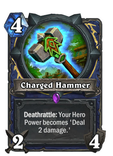 Charged Hammer becomes a 3 mana 2/3 weapon that still transforms your hero power into Lightning Jolt. It’s still not very strong, and Totem strategies are much better than they used to be so losing that hero power could be considered a downside. But cards that transform your hero power are an interesting design space that is unique to Hearthstone. As evidenced by OG Sir Finley, Justicar Trueheart, Genn Greymane, and Baku the Mooneater, hero powers can be pivotal to a deck’s gameplan.